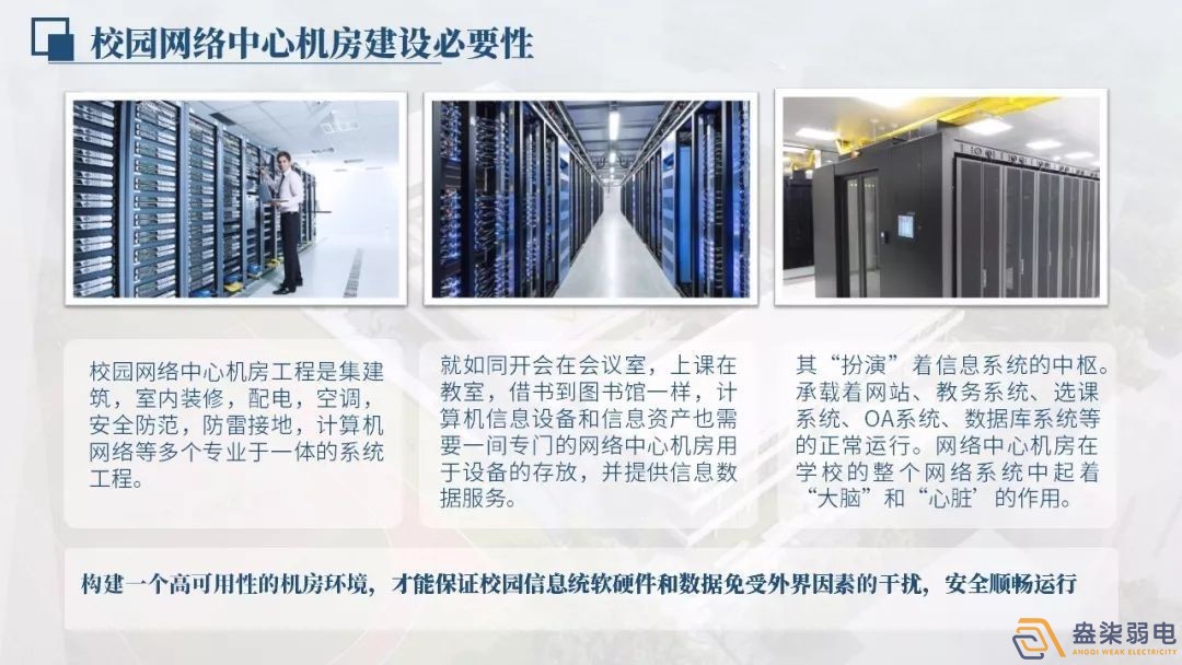 校园网络机房工程项目它集工程建筑,房屋装修,配电设备,空调系统,安全防护,防雷接地线,互联网等多个技术于一体的工程项目。机房系统软件设计与施工的好坏,会直接关系到机房内网络系统是不是安全可靠运行。